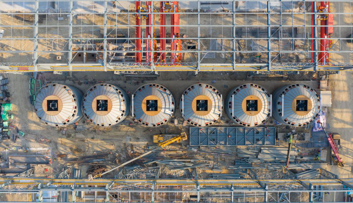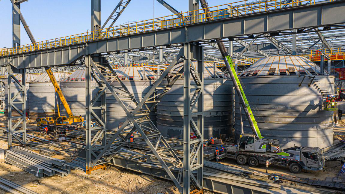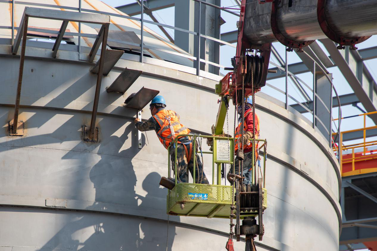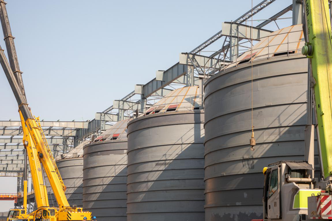 "The steel plate silo project marks Oriental Special Steel's first use of silos for lime storage, replacing the traditional manual feeding method. It is also MCC Huatian's first design, fabrication, and installation project for steel plate silos," said Yang Jian, Project Manager for the Lime Steel Plate Silo Project. Each silo has a diameter of 13 meters and a height of 12.3 meters. The six silos provide a total storage capacity of 5,100 tons and can simultaneously meet a conveying rate of 200 tons per hour. Unlike the sequential construction of typical concrete silos, these steel plate silos were installed using the inverted method. By leveraging the company's professional technical expertise, a reliable installation plan was developed, ultimately employing DHP chain electric hoists. The hoists were activated simultaneously via central control for a uniform lift of the silo structures, completing the process safely over one month.